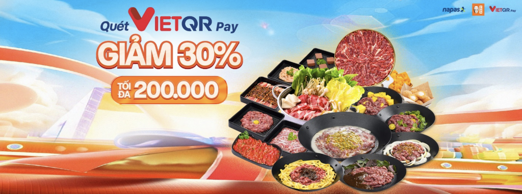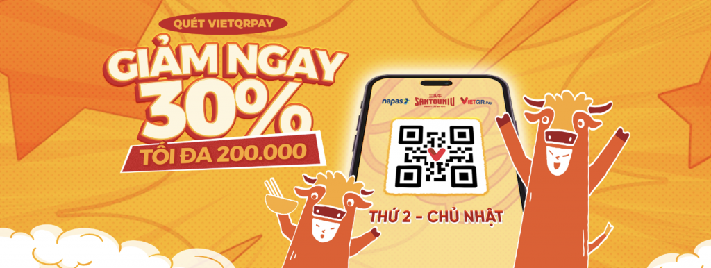Santouniu cũng tặng ngay ưu đãi giảm 30% tối đa 200.000 đồng khi dùng buffet lẩu bò tươi và thanh toán bằng VIETQRPay.