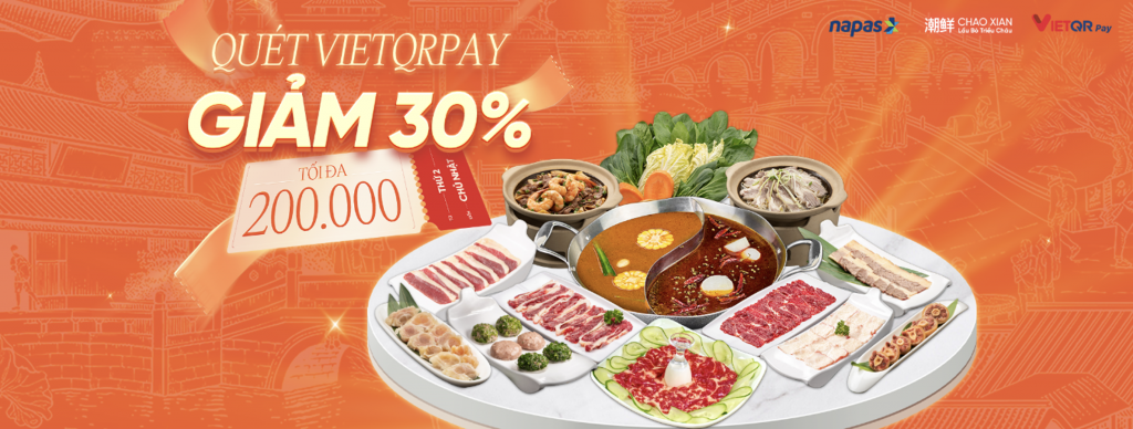 Giảm ngay 30% tối đa 200.000 đồng cho các “fan” của Chao Xian khi thanh toán qua VIETQRPay. Ưu đãi áp dụng cả ngày từ thứ Hai đến Chủ Nhật với các thực khách đặt bàn trước và nhóm từ 4 người lớn.
