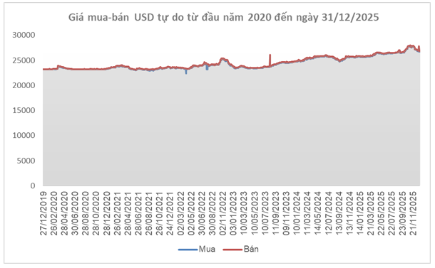 Trong hệ thống ngân hàng, Vietcombank niêm yết USD cuối năm ở mức 26,047 – 26,377 đồng/USD (mua vào – bán ra), cùng giảm 7 đồng ở cả 2 chiều so với tuần trước.
