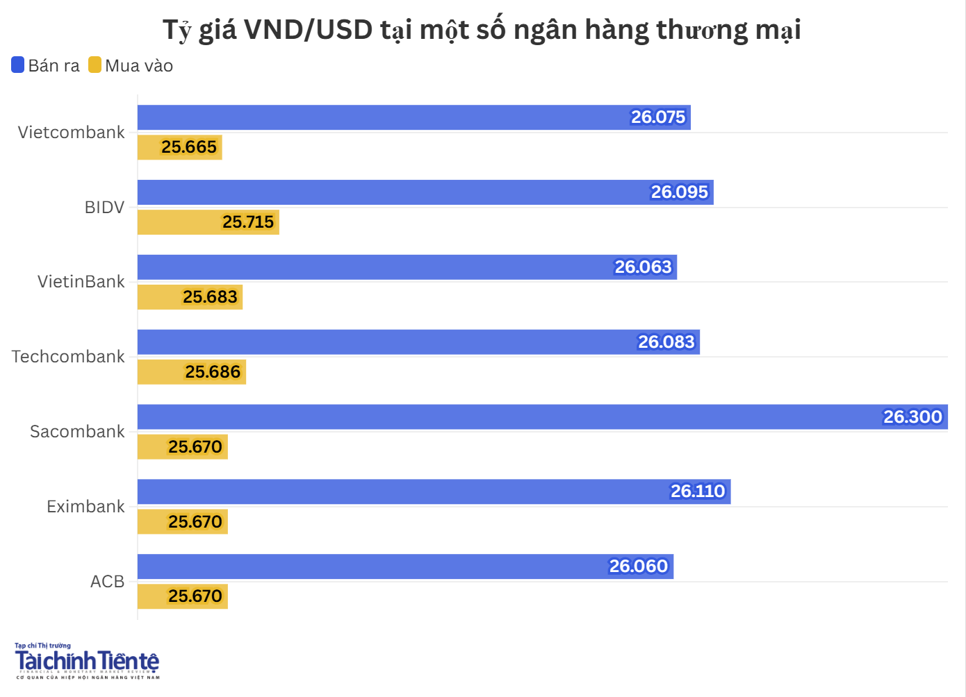 Hiện, giá mua thấp nhất ở mức 25.665 VND/USD, giá mua cao nhất ở mức 25.715 VND/USD. Giá bán ra thấp nhất ở mức 26.060 VND/USD, giá bán cao nhất ở mức 26.300 VND/USD.