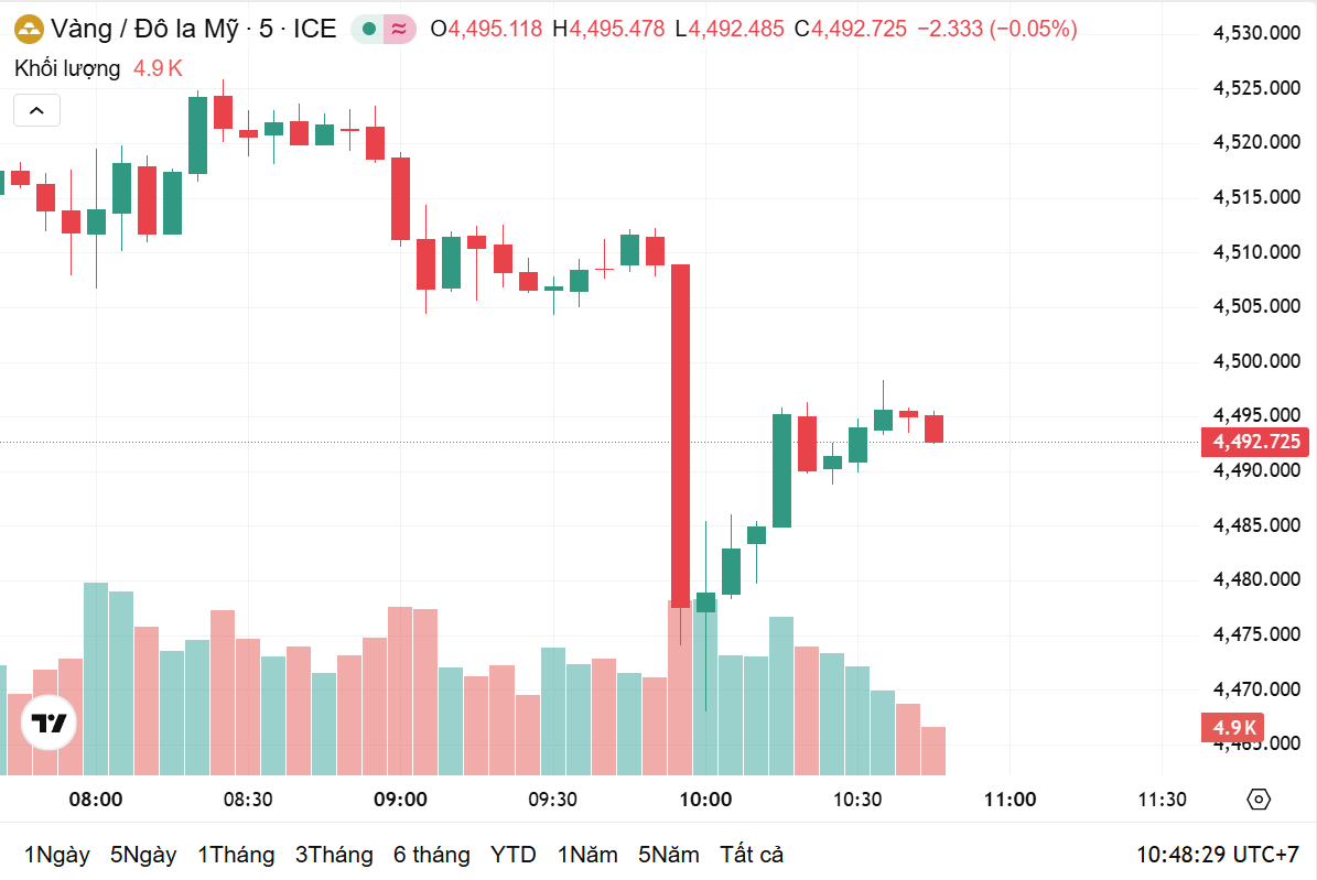Giá vàng trong nước ghi nhận tăng mạnh theo xu hướng chung của thế giới. Thời điểm 10h40' theo giờ Việt Nam, giá vàng thế giới giao ngay ở mức 4.493 USD/ounce, tăng 59,48 USD/ounce so với với đầu phiên sáng. Hiện, giá vàng thế giới quy đổi theo tỷ giá niêm yết tại Vietcombank vào khoảng 143 triệu đồng/lượng.