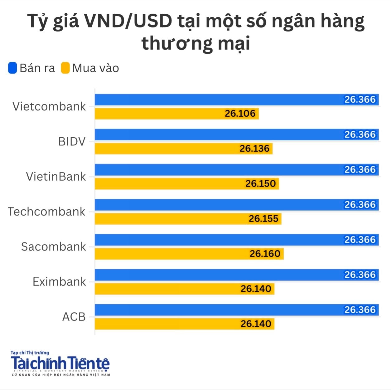 Hiện, giá mua thấp nhất ở mức 26.106 VND/USD, giá mua cao nhất ở mức 26.160 VND/USD. Giá bán được các ngân hàng niêm yết đồng loạt ở mức 26.366 VND/USD.