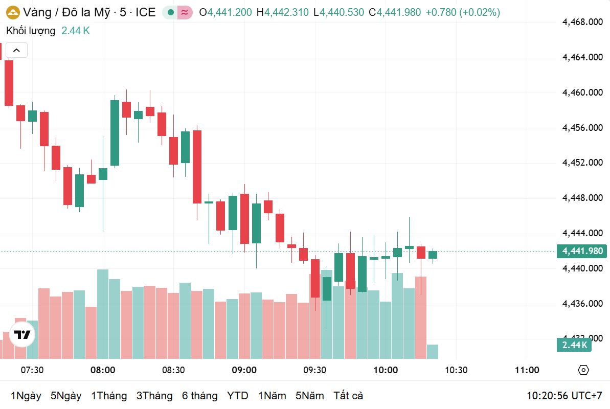 Giá vàng miếng lẫn vàng nhẫn hạ nhiệt theo đà đi xuống của giá thế giới. Thời điểm 9h30' theo giờ Việt Nam, giá vàng thế giới giao ngay ở mức 4.442 USD/ounce, giảm 44 USD/ounce so với với đầu phiên sáng. Hiện, giá vàng thế giới quy đổi theo tỷ giá niêm yết tại Vietcombank vào khoảng 141,27 triệu đồng/lượng.