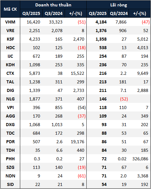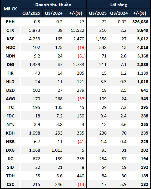 Top 20 doanh nghiệp BĐS có lợi nhuận ròng tăng trong quý 3/2025. Đvt: Tỷ đồng