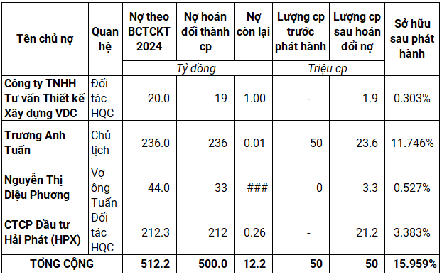 Theo danh sách công bố trước đó, có 4 chủ nợ được hoán đổi cổ phiếu HQC, gồm Công ty TNHH Tư vấn Thiết kế Xây dựng VDC hoán đổi 19 tỷ đồng nợ thành 1.9 triệu cp, nếu thành công, giá trị khoản nợ còn lại còn gần 1 tỷ đồng; ông Trương Anh Tuấn - Chủ tịch HĐQT HQC hoán đổi 236 tỷ đồng nợ thành 23.6 triệu cp, số nợ còn lại gần 11 triệu đồng; bà Nguyễn Thị Diệu Phương (vợ ông Tuấn) 33 tỷ đồng đổi thành 3.3 triệu cp, HQC còn nợ gần 11 tỷ đồng; cuối cùng là CTCP Đầu tư Hải Phát (HOSE: HPX) hoán đổi 212 tỷ đồng nợ thành 21.2 triệu cp, dự kiến chiếm 3.383% vốn điều lệ của HQC sau phát hành, còn nợ lại hơn 256 triệu đồng.