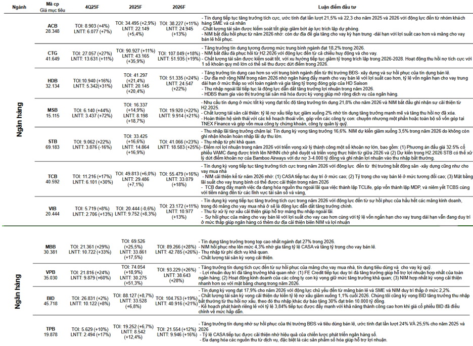 Tuy nhiên, VCBS Research đồng thời nhấn mạnh mức độ phân hóa trong ngành ngày càng rõ rệt. Trong khi nhiều ngân hàng duy trì tăng trưởng lợi nhuận hai chữ số nhờ tín dụng mở rộng và thu nhập ngoài lãi cải thiện, một số ngân hàng khác ghi nhận kết quả thận trọng hơn. Sacombank (STB) được VCBS ước tính lợi nhuận trước thuế quý IV/2025 giảm 16%, xuống 3.876 tỷ đồng, phản ánh áp lực từ thu nhập lãi và quá trình xử lý các khoản tồn đọng cũ.