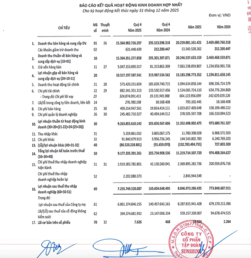 Tập đoàn Sunshine (Mã chứng khoán: KSF) vừa công bố báo cáo tài chính hợp nhất quý IV/2025, cho thấy bức tranh tăng trưởng bứt phá trên mọi chỉ số sau quá trình tái cấu trúc toàn diện được kích hoạt từ năm 2024.