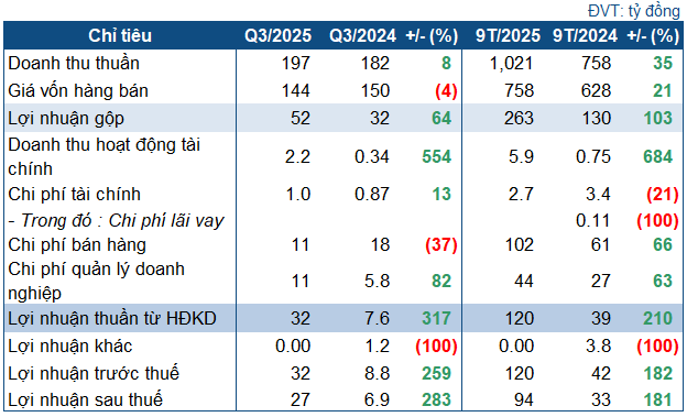 Các chỉ tiêu kinh doanh của NFC trong quý 3/2025 Nguồn: VietstockFinance |