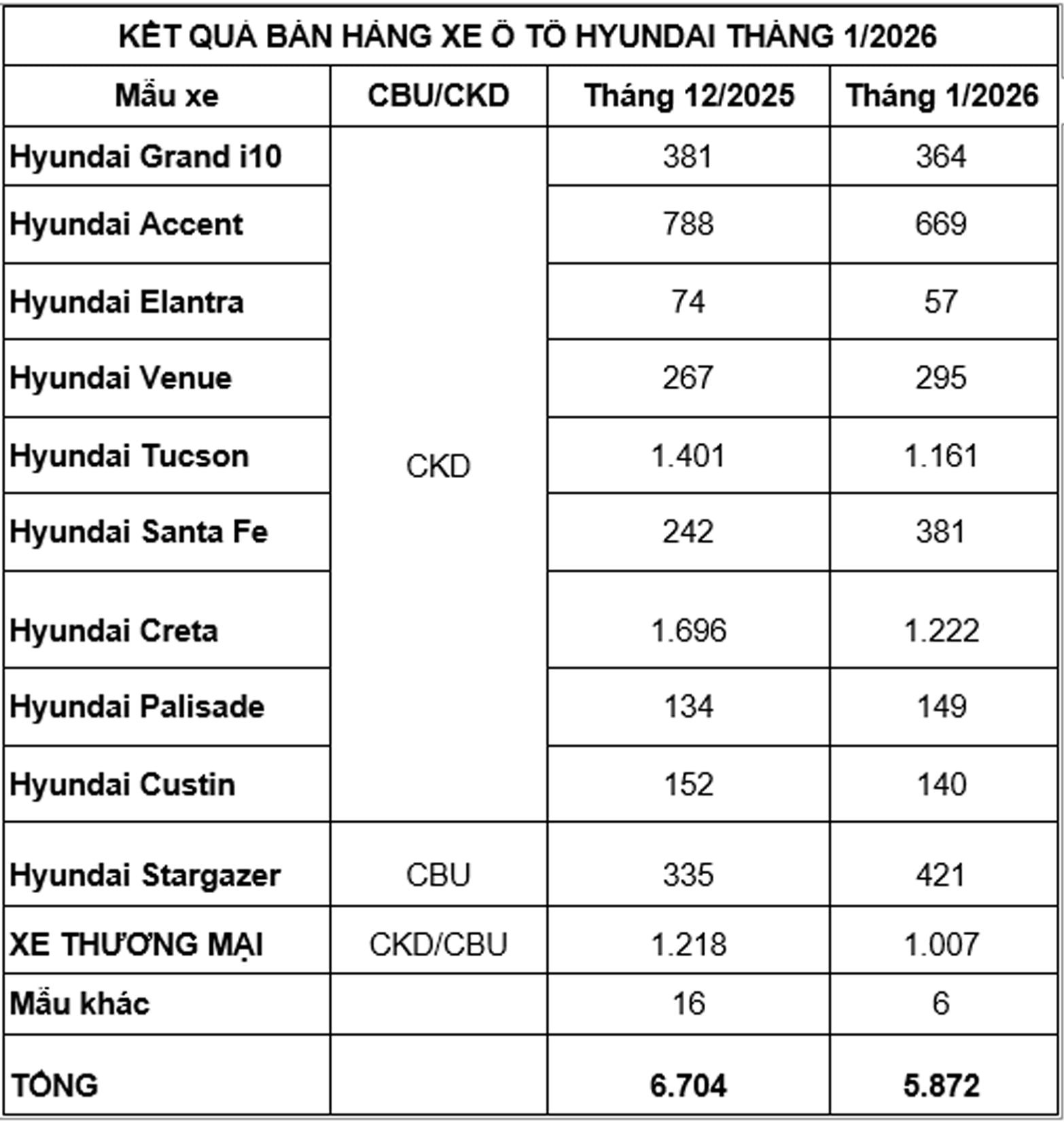 Tập đoàn Thành Công (TC GROUP) vừa thông báo kết quả bán hàng tháng 1/2026. Theo đó, tổng doanh số xe Hyundai trong tháng đạt 5.872 xe.