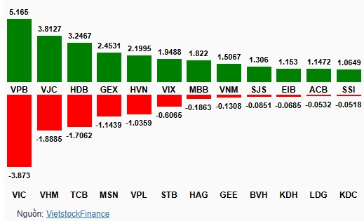 Cổ phiếu nào đóng góp mạnh nhất vào đà tăng của chỉ số?Cổ phiếu VPB của Ngân hàng Việt Nam Thịnh Vượng (VPBank) đã tăng 12.6% trong tuần qua, đóng góp gần 5.17 điểm vào chỉ số.