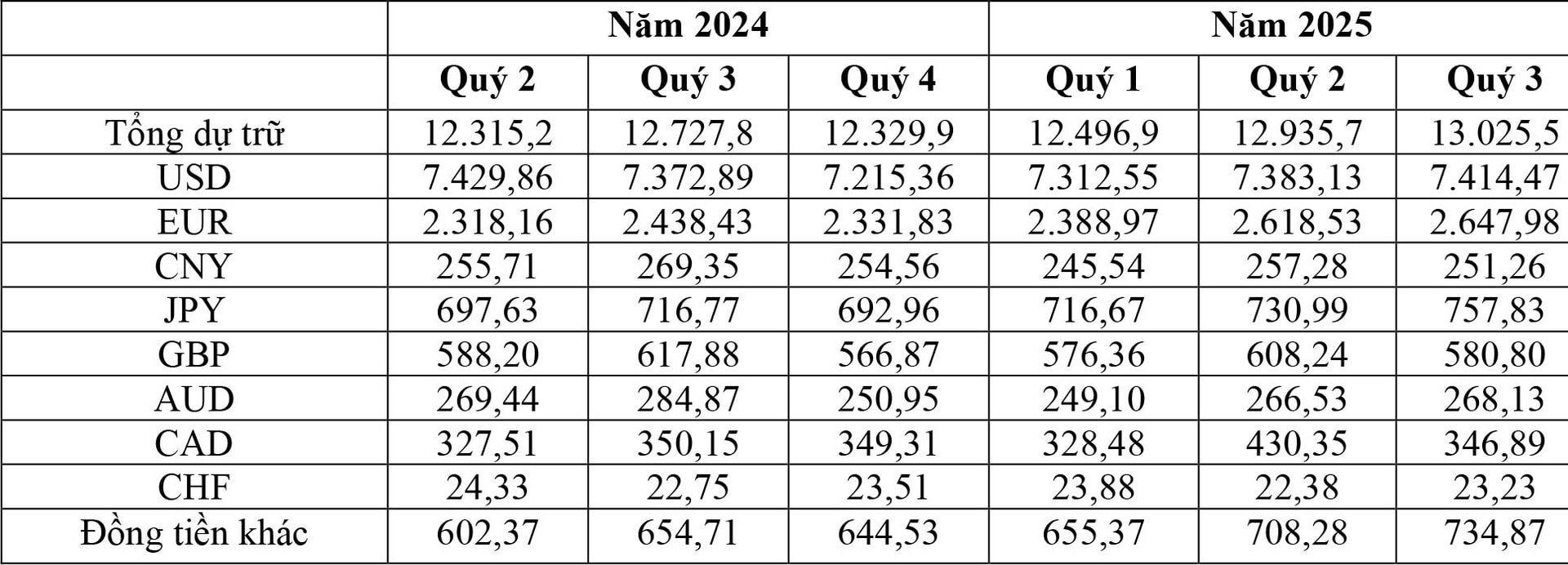 Thống kê cho thấy, tỷ trọng đồng USD giảm dần từ đầu năm xuống 56,92% trong quý III/2025, phản ánh xu hướng mất giá USD so với hầu hết các đồng tiền chủ chốt khác và nhiều đồng bản tệ của các nước mới nổi. USD mất giá đã giúp đồng Euro (EUR) tăng gần 14,0% trong năm 2025 với tỷ giá 1,1775 USD, đồng Franc Thụy Sĩ (CHF) tăng 14,5%, trong khi tình hình Nhật Bản tháng 12 đã khiến đồng Yên Nhật (JPY) đi ngang (dao động quanh tỷ giá 155,85 JPY/USD), thấp xa khung tỷ giá 158-160 buộc Ngân hàng Trung ương Nhật Bản (BoJ) phải can thiệp. Đáng chú ý, đồng Nhân dân tệ của Trung Quốc (CNY) tăng giá, đạt tỷ giá dưới 7 CNY/USD, lần đầu tiên kể từ năm 2023. Chủ trương hòa giải của Tổng thống Mỹ Donald Trump trong quan hệ với CHLB Nga đã giúp đồng Rúp Nga (Ruble) phục hồi 40%, trong khi nhiều đồng tiền châu Âu tăng giá với mức tăng 15-21%, đồng Peso của Mêhicô và Real của Brazil cũng tăng 2 con số. Dự trữ EUR tăng từ tỷ trọng 20,24% trong quý trước lên 20,33% trong quý III/2025; dự trữ CNY giảm nhẹ xuống 1,93% từ tỷ trọng 1,99% trong quý II/2025.