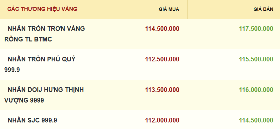 Tương tự vàng miếng, giá mua - bán vàng nhẫn cũng được các thương hiệu SJC, DOJI, Phú Quý và Bảo Tín Minh Châu điều chỉnh tăng 300.000 - 500.000 đồng/lượng ở cả hai chiều mua - bán so với phiên trước. Hiện giá vàng nhẫn thấp hơn vàng miếng khoảng 1,3 - 4,3 triệu đồng/lượng.