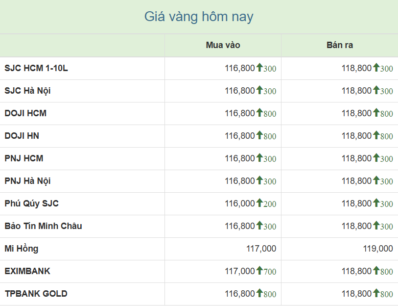 Công ty Vàng bạc đá quý Sài Gòn (SJC), PNJ và Bảo Tín Minh Châu cùng niêm yết giá mua - bán vàng miếng ở mức 116,8 – 118,8 triệu đồng/lượng, tăng 300.000 đồng/lượng chiều mua - bán so với phiên trước.