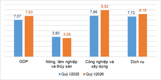 Tổng sản phẩm trong nước (GDP) quý I/2026 ước tăng 7,83% so với cùng kỳ năm trước, cao hơn mức tăng 7,07% của cùng kỳ năm 2025. Trong đó, khu vực nông, lâm nghiệp và thủy sản tăng 3,58%, đóng góp 5,60% vào mức tăng tổng giá trị tăng thêm của toàn nền kinh tế; khu vực công nghiệp và xây dựng tăng 8,92%, đóng góp 44,08%; khu vực dịch vụ tăng 8,18%, đóng góp 50,32%. Những số liệu này cho thấy, khu vực dịch vụ không chỉ đạt tốc độ tăng trưởng khá mà còn đóng góp tỷ trọng lớn nhất vào mức tăng chung, khẳng định vai trò là động lực tăng trưởng quan trọng của nền kinh tế.