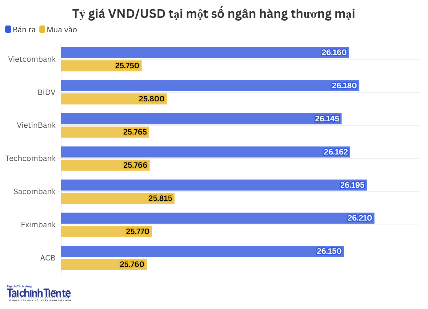 Hiện, giá mua thấp nhất ở mức 25.750 VND/USD, giá mua cao nhất ở mức 25.810 VND/USD. Giá bán ra thấp nhất ở mức 26.145 VND/USD, giá bán cao nhất ở mức 26.210 VND/USD.