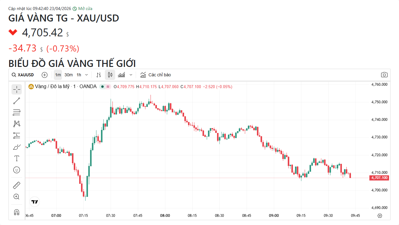Đà giảm của giá vàng trong nước chịu ảnh hưởng bởi diễn biến của giá vàng thế giới. Thời điểm 9h40 ngày 23/4 theo giờ Việt Nam, giá vàng thế giới giao ngay ở mức 4.705 USD/ounce, giảm 0,73% - tương ứng với mức giảm 34,73 USD/ounce so với giờ mở cửa phiên liền trước. Giá vàng thế giới quy đổi sang Việt Nam đồng hiện khoảng 149,5 triệu đồng/lượng.