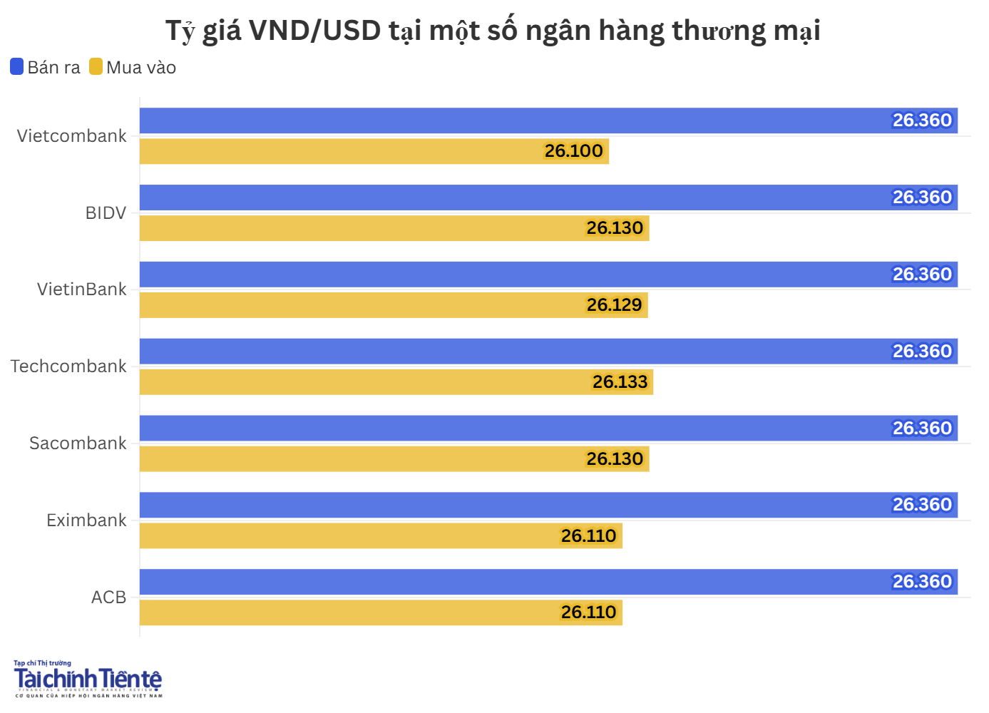 Hiện, giá mua thấp nhất ở mức 26.100 VND/USD, giá mua cao nhất ở mức 26.133 VND/USD. Giá bán được các ngân hàng niêm yết đồng loạt ở mức 26.360 VND/USD.