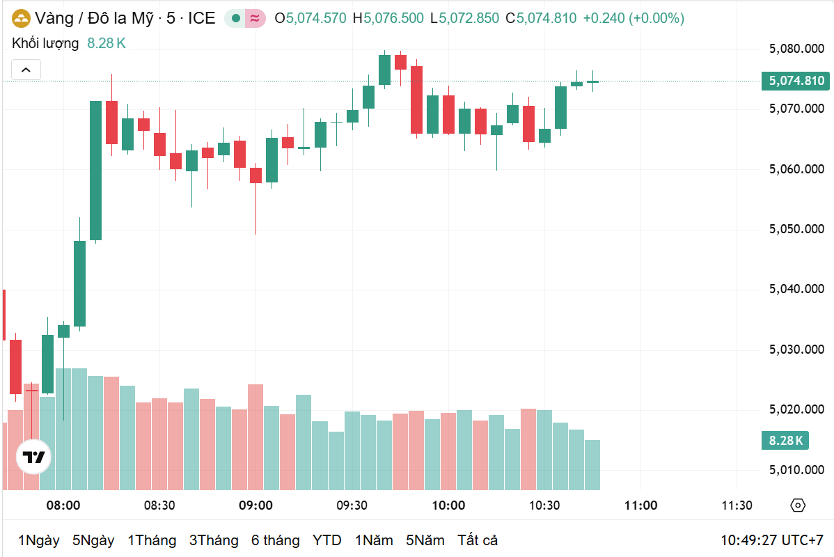 Thời điểm 10h00 theo giờ Việt Nam, giá vàng thế giới giao ngay ở mức 5.075 USD/ounce, tăng 1,75% trong 24 giờ qua, tương ứng với tăng 87,37 USD/ounce. Hiện, giá vàng thế giới quy đổi sang tiền Việt Nam đồng có giá là 161,27 triệu đồng/lượng.