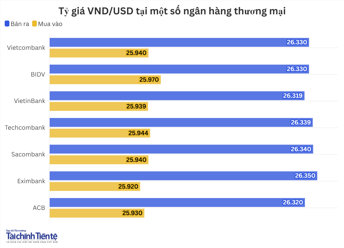 Hiện, giá mua thấp nhất ở mức 25.920 VND/USD, giá mua cao nhất ở mức 25.970 VND/USD. Giá bán thấp nhất ở mức 26.319 VND/USD, giá bán cao nhất ở mức 26.350 VND/USD.