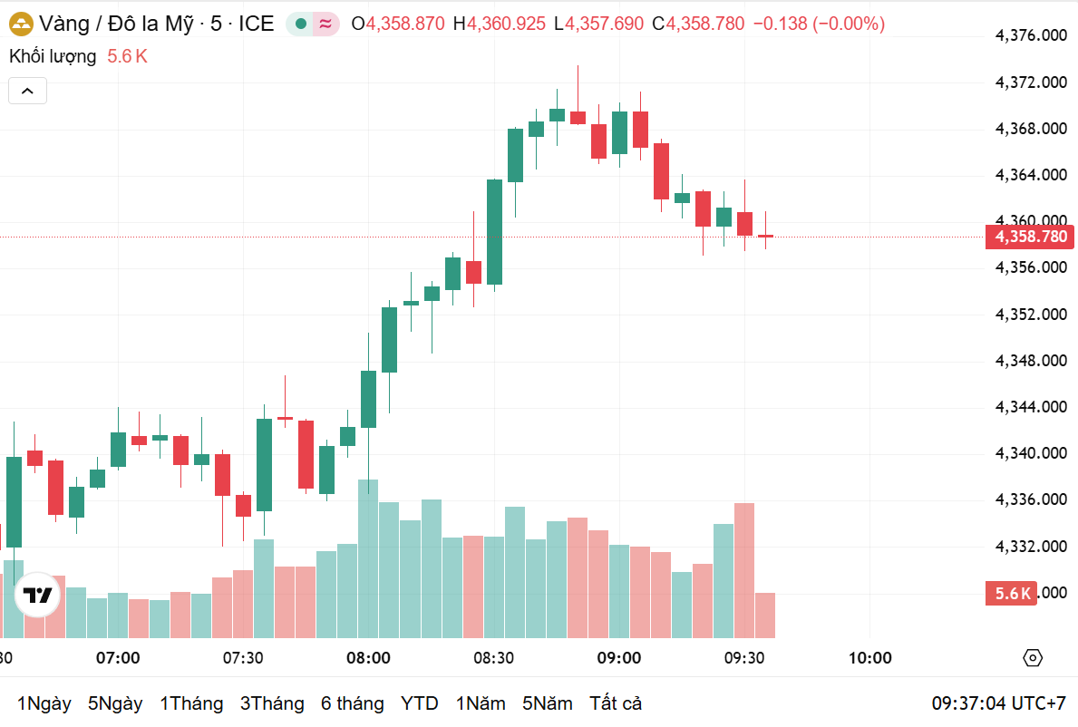 Thời điểm 9h35' theo giờ Việt Nam, giá vàng thế giới giao ngay ở mức 4.358 USD/ounce, tăng 31 USD/ounce so với với đầu phiên sáng. Hiện, giá vàng thế giới quy đổi theo tỷ giá niêm yết tại Vietcombank vào khoảng 138,6 triệu đồng/lượng.