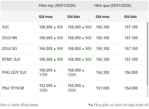 Công ty Vàng bạc đá quý Sài Gòn (SJC), Tập đoàn Vàng bạc Đá quý DOJI và Bảo Tín Minh Châu cùng niêm yết giá vàng miếng SJC mua vào-bán ra ở mức 156-158 triệu đồng/lượng, tăng 900 nghìn đồng ở cả chiều mua và chiều bán ra so với chốt phiên trước.