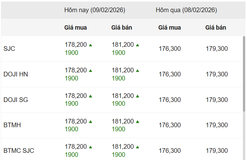 Công ty Vàng bạc đá quý Sài Gòn (SJC), Tập đoàn Vàng bạc Đá quý DOJI, Bảo Tín Minh Châu, Bảo Tín Mạnh Hải và Phú Quý SJC cùng niêm yết giá vàng miếng SJC mua vào-bán ra ở mức 178,2-181,2 triệu đồng/lượng, tăng 1,9 triệu đồng ở cả chiều mua và chiều bán ra so với phiên trước.