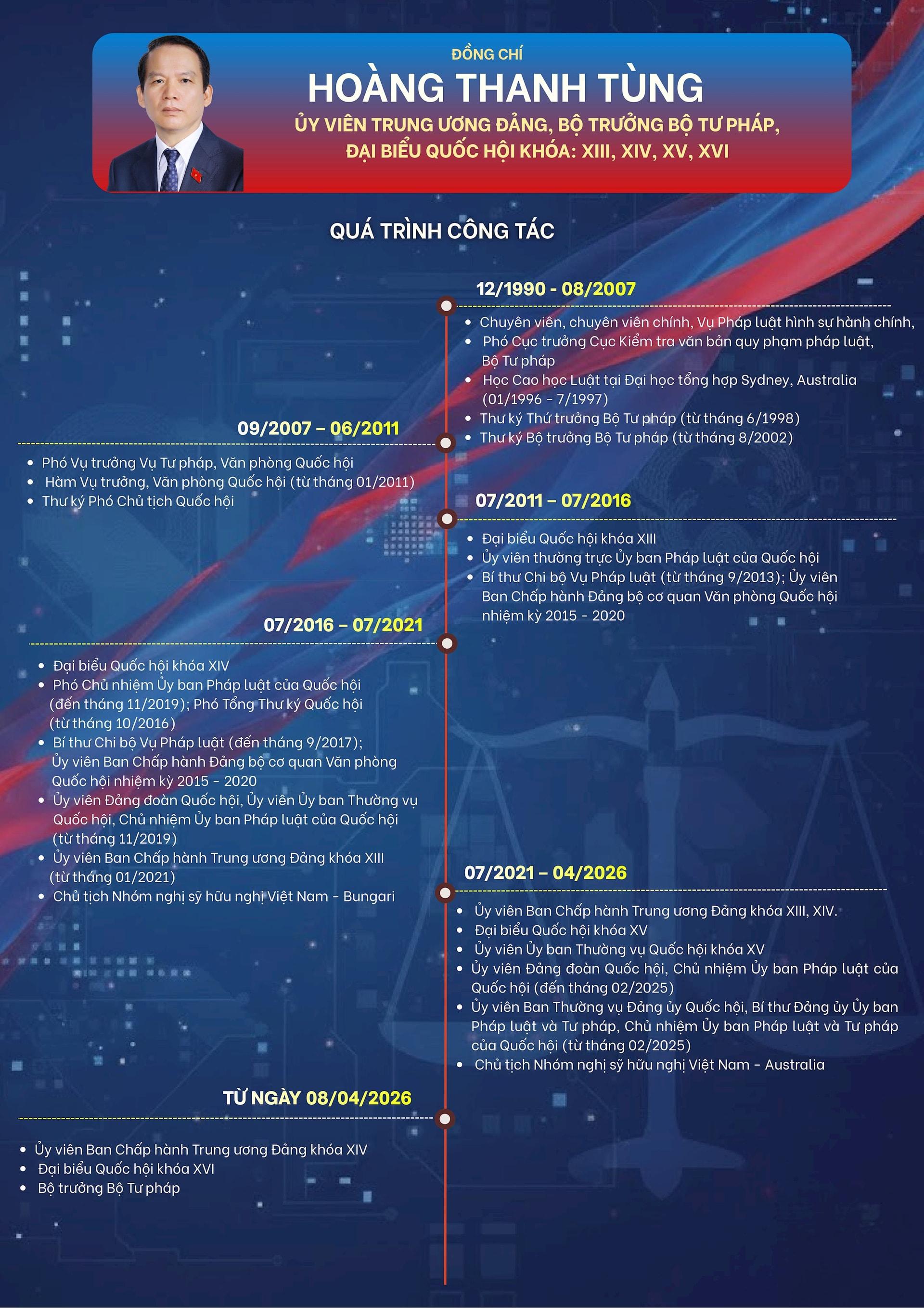 Ngày 8/4/2026, tại Kỳ họp thứ Nhất, Quốc hội khóa XVI đã biểu quyết thông qua Nghị quyết phê chuẩn đề nghị của Thủ tướng Chính phủ về việc bổ nhiệm Bộ trưởng và thành viên khác của Chính phủ nhiệm kỳ 2026 - 2031. Theo đó, ông Hoàng Thanh Tùng được bổ nhiệm giữ chức Bộ trưởng Bộ Tư pháp.
