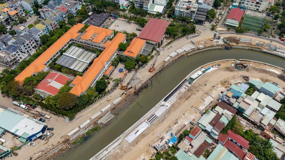 Nhìn từ trên cao, công trường gói thầu XL03 đoạn qua Trường Đại học Văn Lang hoạt động nhộn nhịp với máy xúc, xe cẩu bám sát mép rạch. Ảnh: Anh Tú