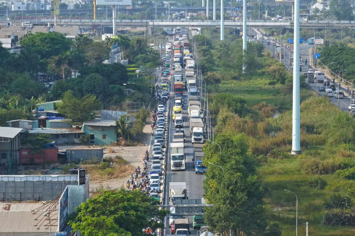 Tại hiện trường, dòng xe tải, xe container kéo dài hơn 3 km trên đường Võ Chí Công. Hiện nguyên nhân vụ va chạm giao thông đang được điều tra làm rõ.