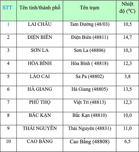 Nhiệt độ thấp nhất về đêm và sáng sớm ở Bắc Bộ, Thanh Hóa và Nghệ An phổ biến từ 8 - 11 độ C, riêng khu vực vùng núi Bắc Bộ phổ biến 4 - 7 độ C, vùng núi cao có nơi dưới 3 độ C. Khu vực từ Hà Tĩnh đến Thừa Thiên Huế phổ biến từ 13 - 16 độ C.